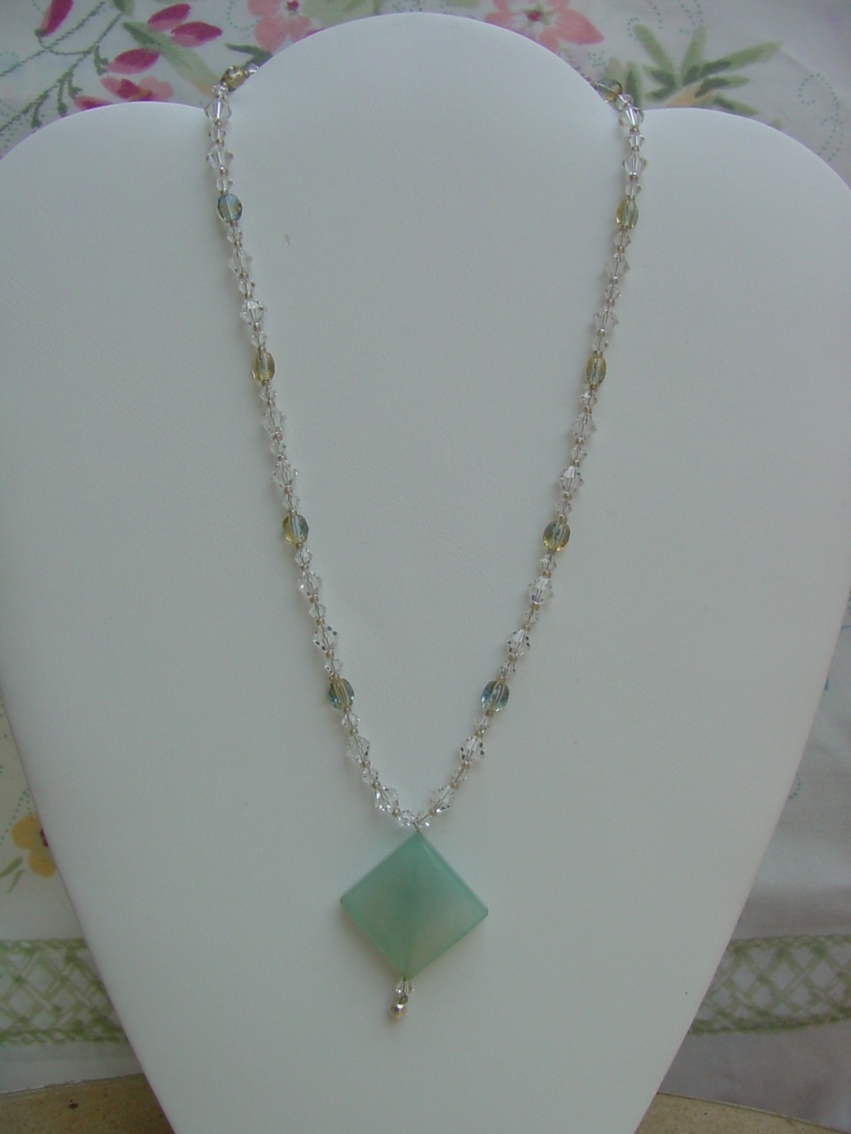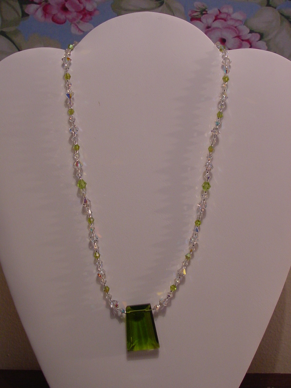 Necklace with Swarovski crystals, glass spacer beads and a green trapezoid glass pendant w/ 925 -sterling silver toggle clasp