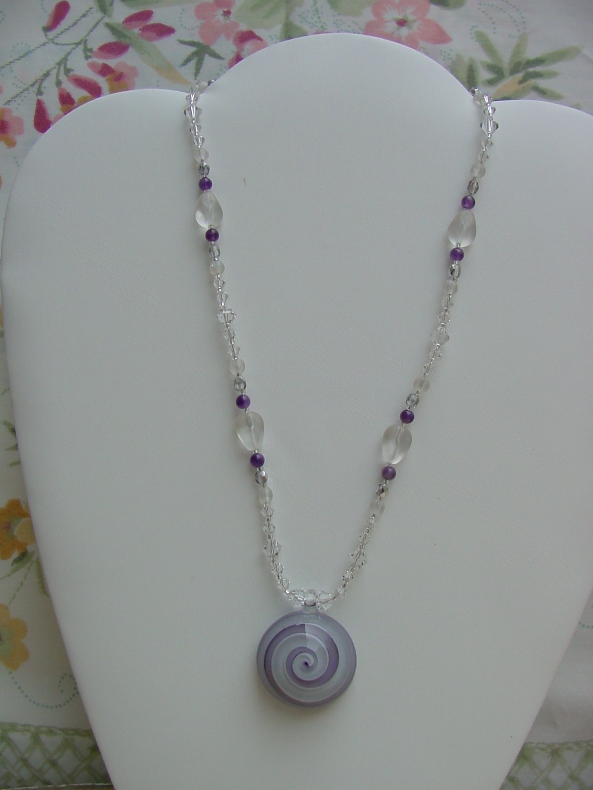 Necklace w/ Swarovski crystals, glass beads, amethyst beads and art glass pendant with 925 sterling silver toggle
