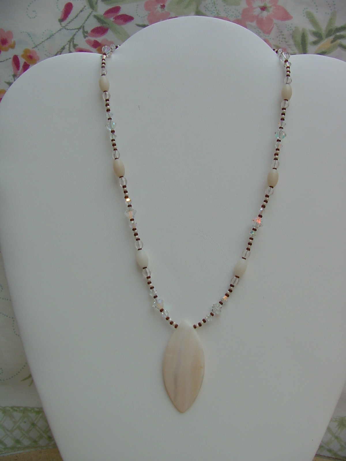 Necklace w/ Swarovski crystals, plastic beads, glass bead spacers and natural shell pendant with magnetic clasp