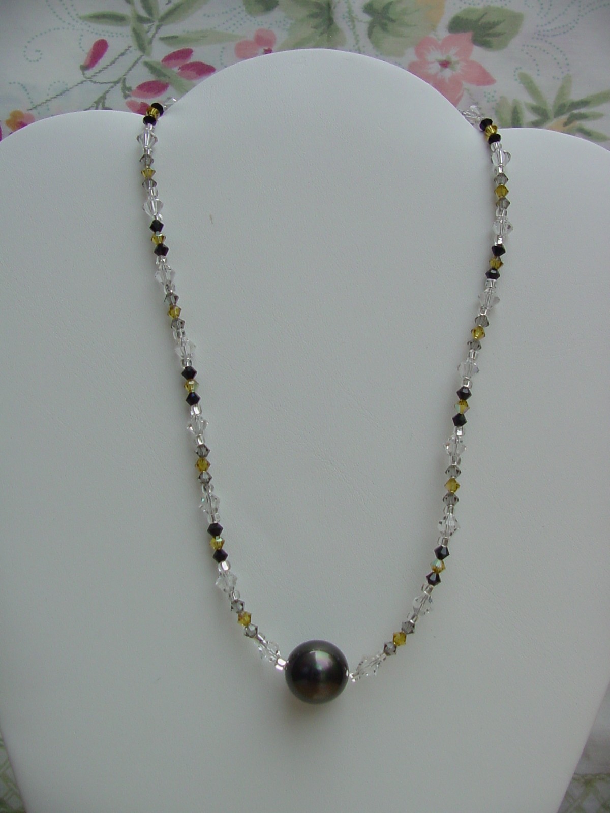 Necklace w/ Swarovski crystals, and large glass pearl bead with 925 sterling silver toggle clasp