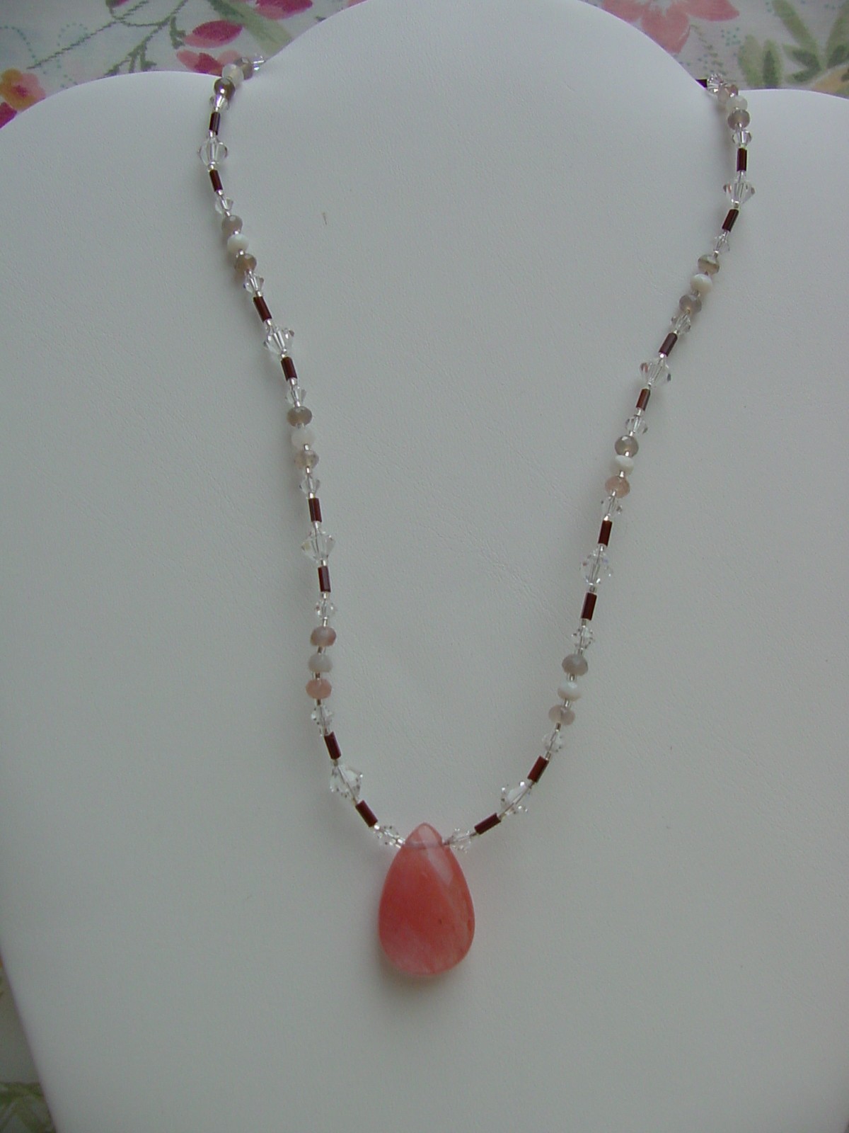 Necklace w/ swarovski crystals, natural stone beads, glass spacers with natural rose quartz pendant with magnetic clasp