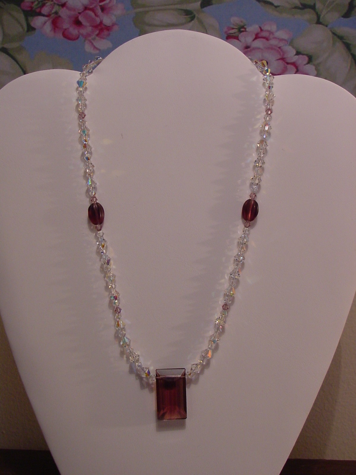 Necklace with Swarovski crystals, glass beads and a purple trapezoid glass pendant w/ 925 sterling silver toggle clasp