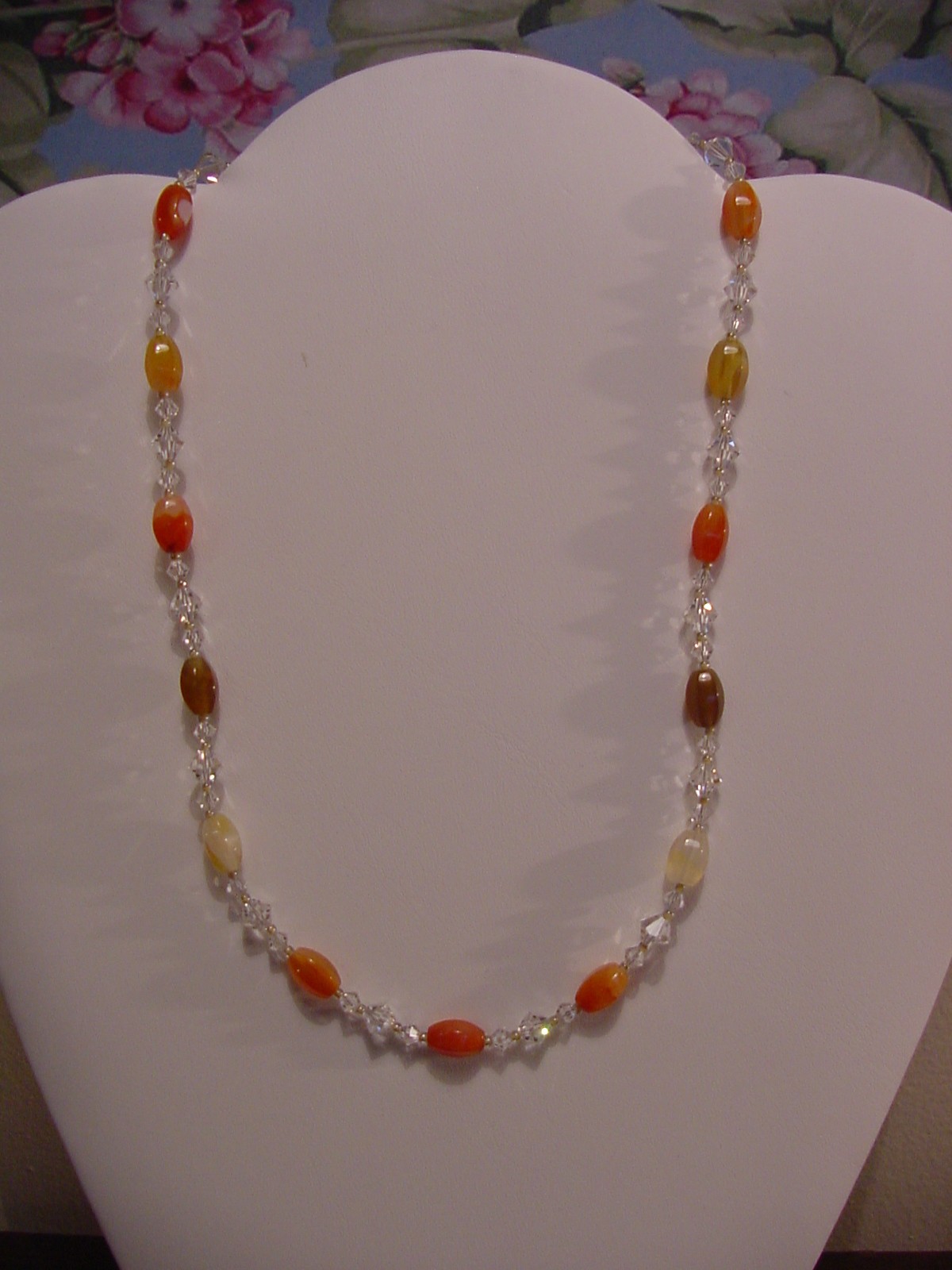 Necklace with Swarovski crystals, glass spacer beads and natural carnelian stones w/ magnetic clasp