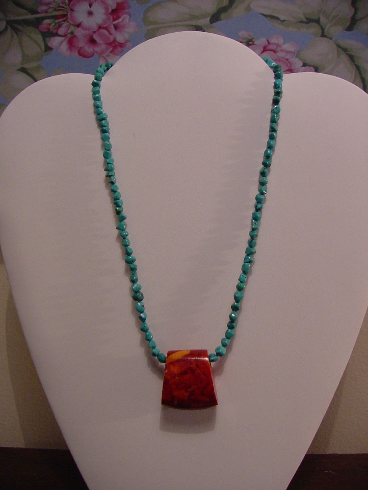Necklace with natural turquoise stones and sponge coral pendant w/ 925 sterling silver lobster claw clasp