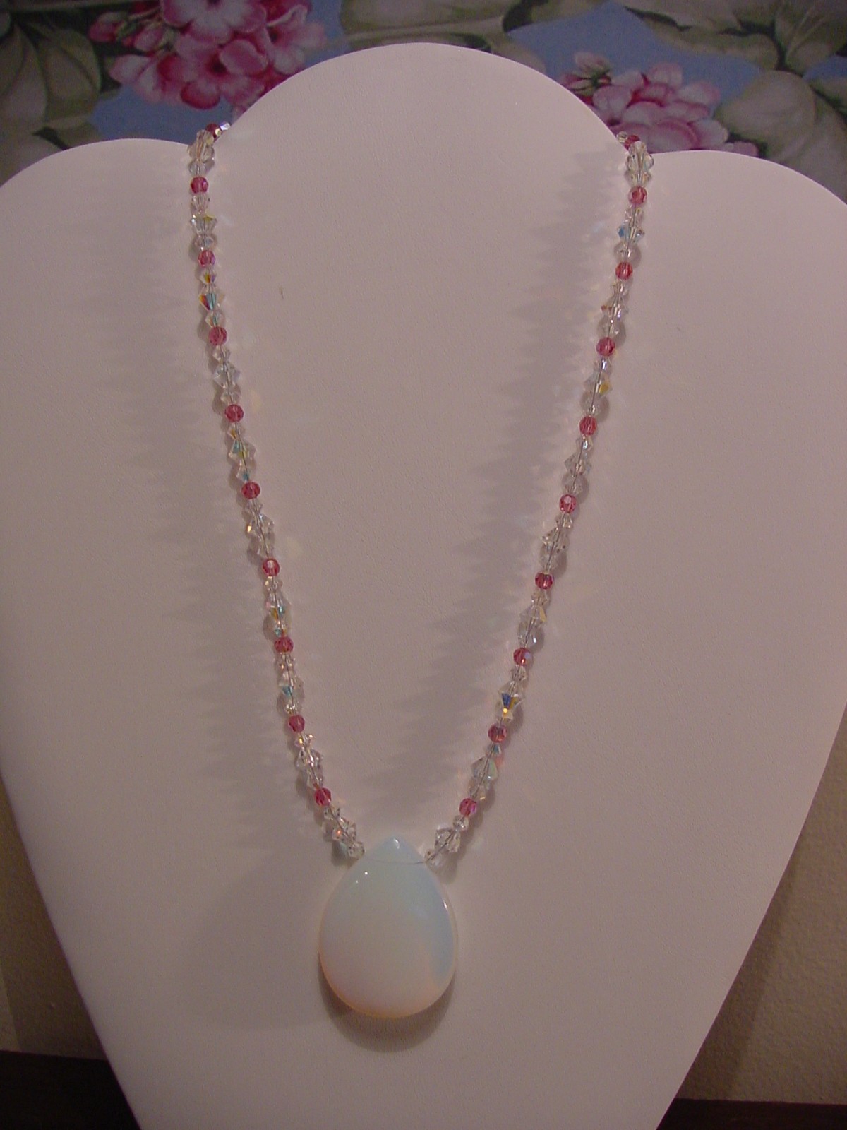 Necklace with Swarovski crystals and opalescent teardrop pendant w/ 925 sterling silver toggle clasp